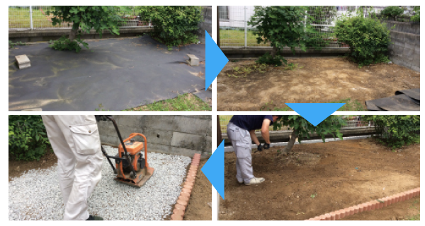 雑草等を除去し、下地が柔らかい場合は、砕石を敷き転圧機等を用いて、平らに締め固めて下さい。