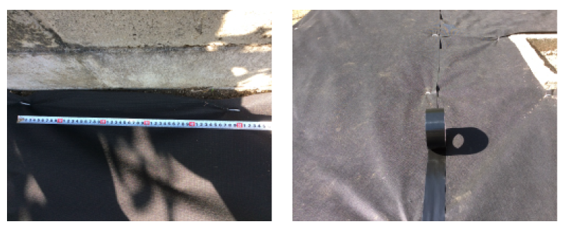 (テープを張り付けることにより砂利が埋没、雑草の繁殖を防ぐのに効果的です。)