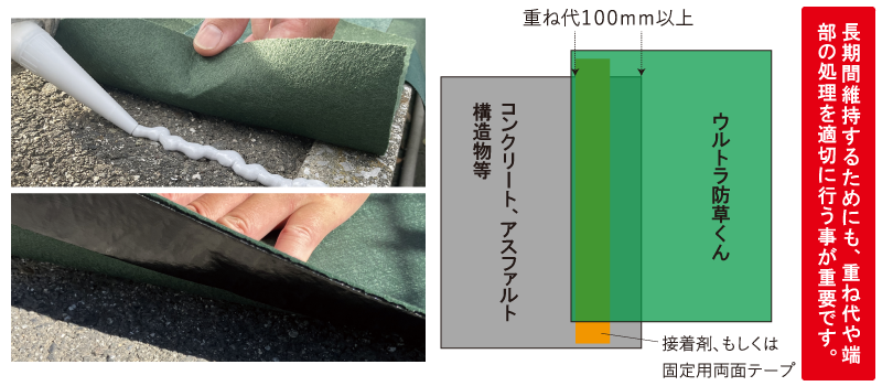 端部からの雑草を抑制し、風の吹き込みによる捲れや剥がれを防止します。