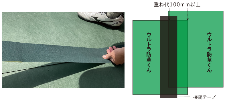 次に重ね代部分を塞ぐように接続テープを貼り、ローラー等で転圧を掛けて下さい。